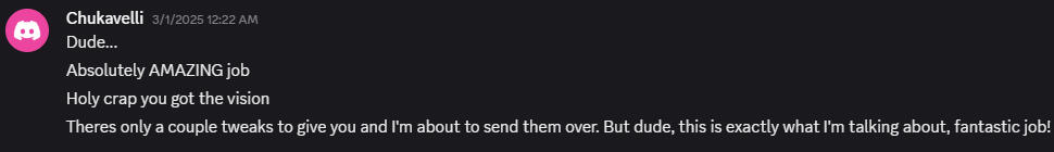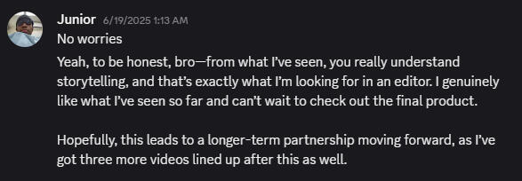 He's a one of a kind editor who doesn't need to be babysat through the editing of the video. Explain what you want to him and he gets it done and if theres any adjustments that need to be made he makes them at a moments notice with no hassle required. He's very timely and is an excellent communicator. Very happy with the work we've done so far, couldn't have asked for better.